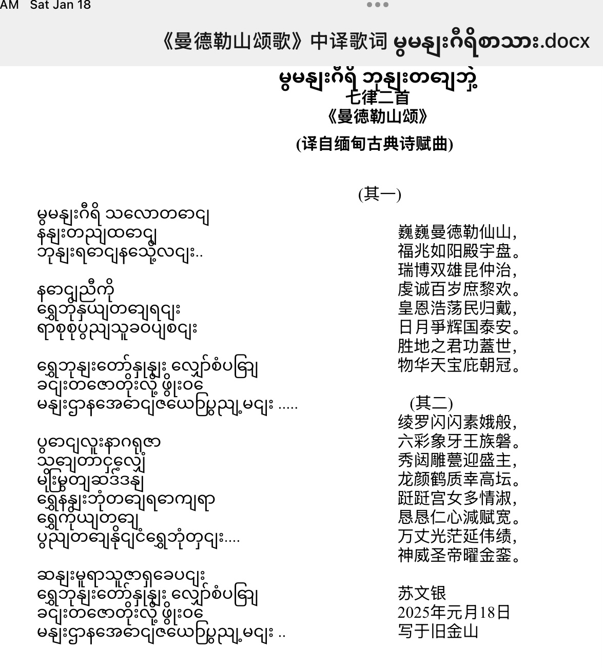 转载请注明:《七律二首《曼德勒山颂》(译自缅甸古典诗赋曲)(苏文银)》 复制链接