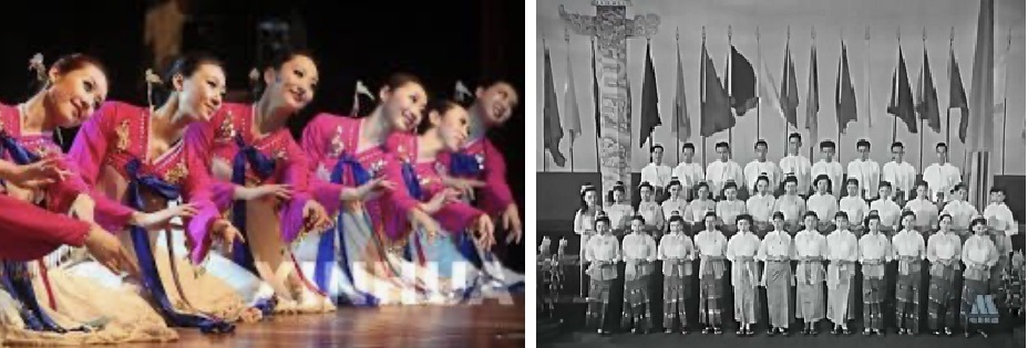 左:中国歌舞团访问仰光演出,右:缅甸歌舞团访问北京演出