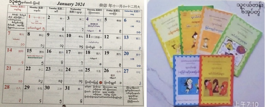 左:缅甸月曆(2024-1),右:缅甸幼儿课本