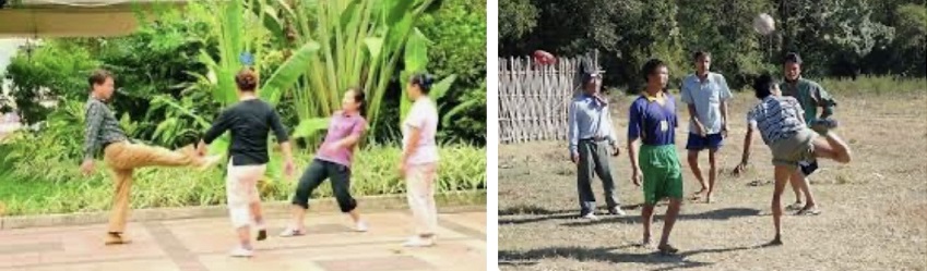 左:中国人爱踢毽子,右:缅甸人爱踢藤球