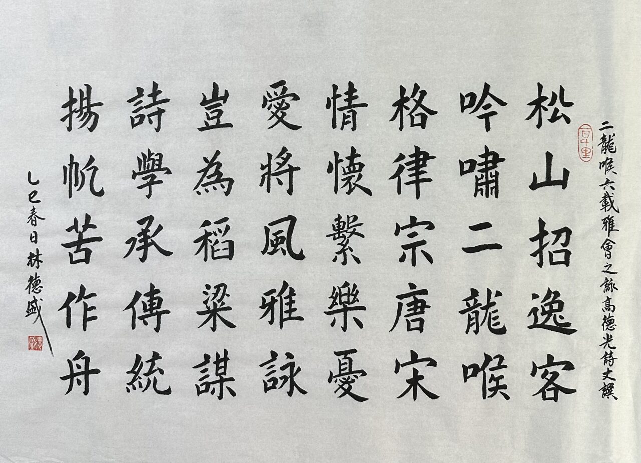 . . 華夏文明今古傳, 楚辭漢賦宋唐篇。 濠江薈萃吟風雅, 葡韻悠揚入管絃。 融滙中西相碰撞, 切磋音律共承宣。 好將世界詩歌節, 砥礪騷壇笑比肩。 书法 一〉馮利發 二〉劉北照 三〉茂松 四〉黎勝培 五〉周永騰 六〉吳錦蓮...