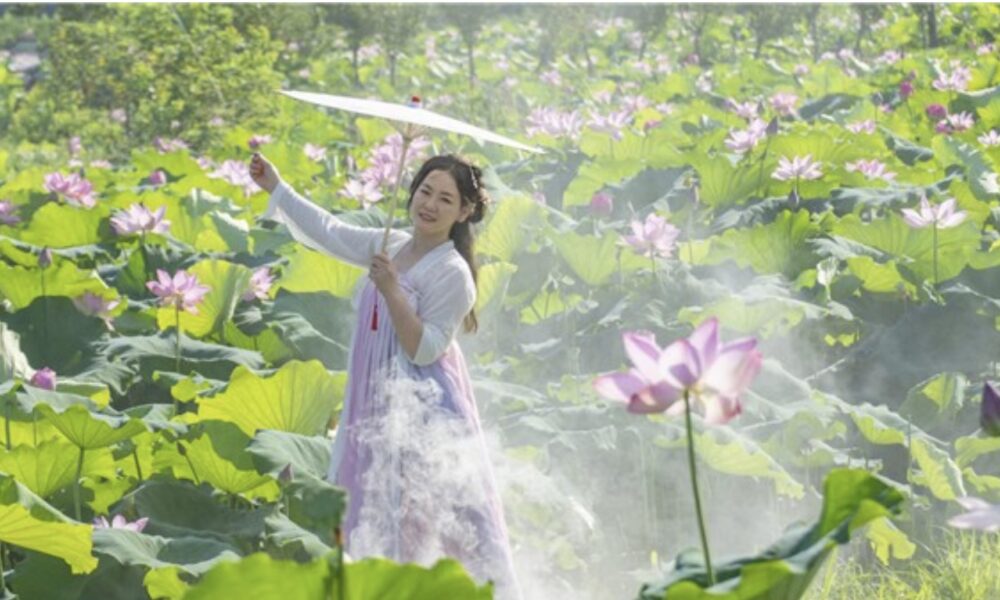 花伞罗裙览荷塘。