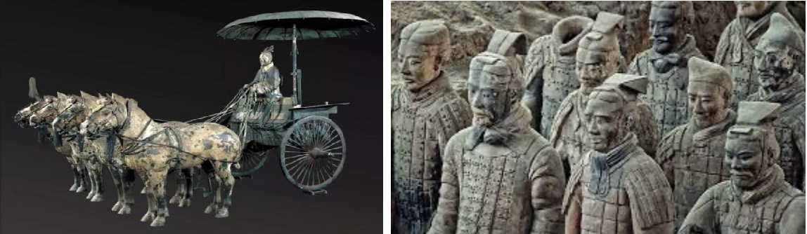 左:秦始皇陵铜车马,右:秦军兵马俑雕塑