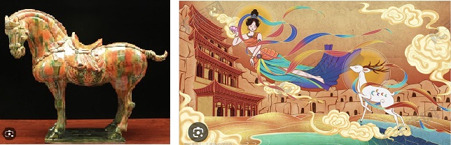 左:唐三彩骏马瓷塑,右:唐朝莫高窟飞天彩绘