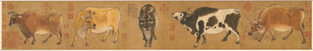 唐朝宰相画家韓滉"五牛图"纸画,五牛个个身强力壮,姿态各异,栩栩如生,体现了唐朝以农为本,依靠耕牛,大力发展农业生产,经济繁荣,人民丰衣足食。各国商人前来通商,各国使者前来朝拜称臣。骠国(缅甸)国王派遣太子率领庞大歌舞团,不远万里,前往古都长安,携带礼品,友好访问。