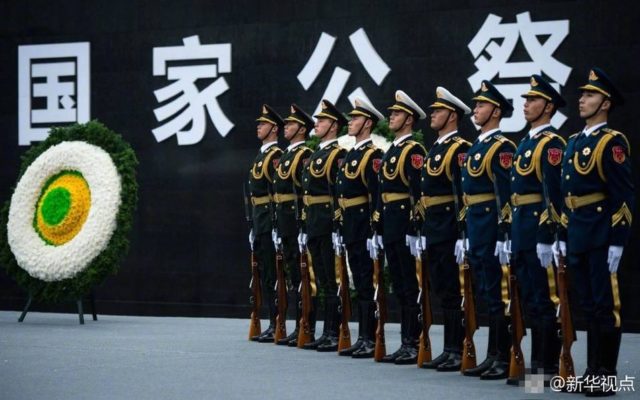 12月13日是南京大屠杀死难者国家公祭日。当天上午,党和国家领导人出席在侵华日军南京大屠杀遇难同胞纪念馆举行的国家公祭仪式。与此同时,全国多地也同步举行悼念活动。图为公祭仪式现场。(新华网 席航飞 摄)