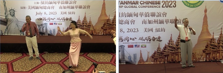外地代表团的节目则是三藩市南友团陈锡泉演唱的中缅经典歌曲颇受青睐,掌声此起彼伏。我们南加州代表团朱国盛用英语演唱"纽约 纽约",在纽约歌颂纽约,声音洪亮,掌声不断。蔡煜群先生登台演唱拿手台湾名歌"爱拼才会赢",台下观众拍手随和,场面动人。85岁的我以亮丽的缅装,五六十年代缅甸著名舞蹈家瑞曼丁貌的名歌成功"昂把摄"登台献丑,因为很少有男士跳缅甸舞,物以稀为贵,得到与会观众的欣赏。我在舞台上跳,台下观众打拍助威,有的纽约女演员在下面学跳,手舞足蹈,配合默契,场面十分热闹。