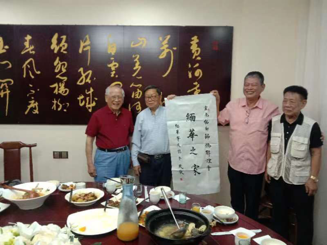 有朋自远方来,不亦乐乎,这次澳门缅华笔友协会一行四人,来云南参加”南侨机工回国抗战八十四周年”活动,听说你们的到来,我们甚是欣喜,虽然彼此相隔遥远,但伊洛瓦底江畔的土地都曾经孕育过我们,它让我们变的亲切,我们云南省侨联缅甸归侨侨眷联谊会十分注重这份情感,两天的交流,双方增进了彼此了解,尤肖松老师七日晚上宴请了在昆的曾就读过中国小学的学生,大家相叙甚欢,尤肖其高级工程师也介绍了他在工作中亲眼目睹的祖国科技方面日新月异的发展变化,八日下午云南省缅甸归侨侨眷联谊会。宴请了澳门朋友。澳门缅华笔会由书法家尤肖松老师挥毫泼墨写下了”缅华之家”赠予我会。使当天的晚宴达到高潮。