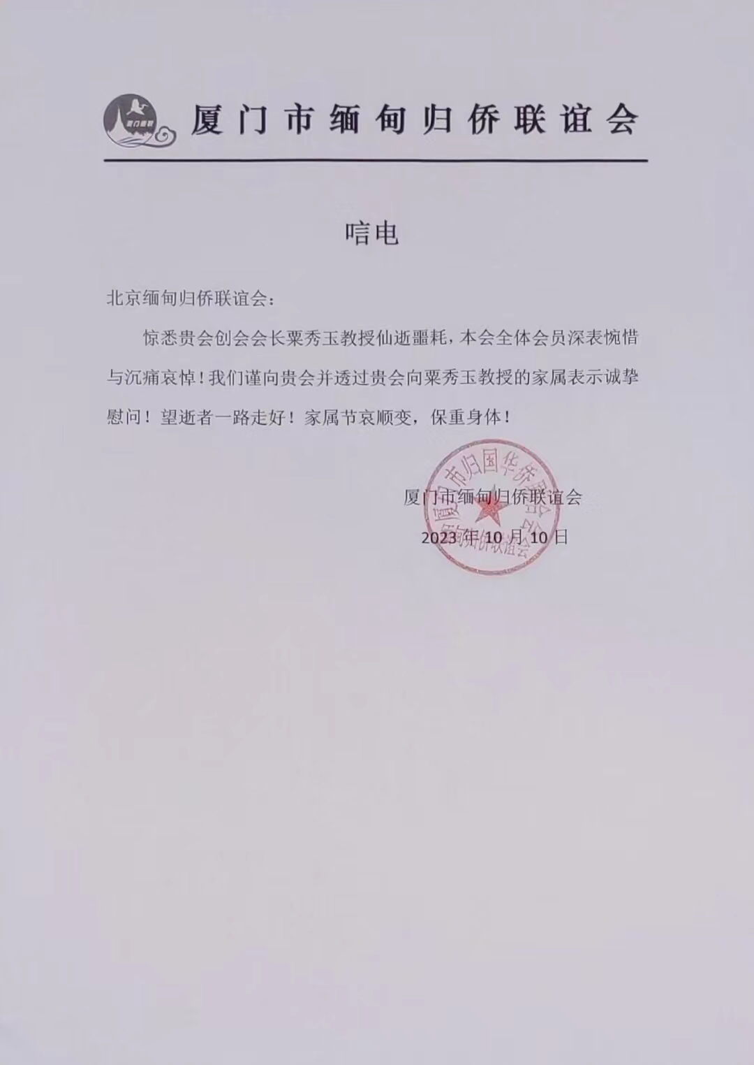 转载请注明:《唁电(厦门市缅甸归侨联谊会)》 复制链接