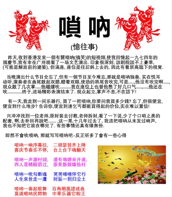 当晚演出什么节目全忘了,但有一個节目至今难忘,那就是「嗩吶独奏」,這嗩吶吹的实在悦耳动听,演奏家在曲尾拉長音,鼓起双腮,瞪著双眼,使勁的將尾音吹完,可是……他沒有吹完啊…..,觀众鼓了几次掌……,他繼續吹……,我也在座位上替他憋了好几囗气,不管用……,終於,這场精彩表演結束了,观眾起立,掌声不息,不在話下!
