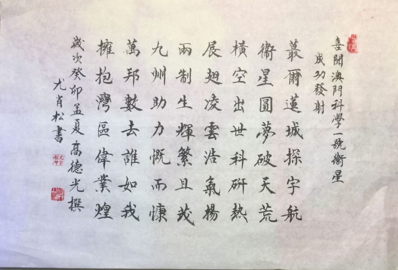 转载请注明:《喜聞《澳門科學一號》衛星成功發射(文/德光,书法/溫子成,尤肖松,黃玉靈,茂松,阮偉生,何麗嬋,周永騰,黃偉華)》 复制链接