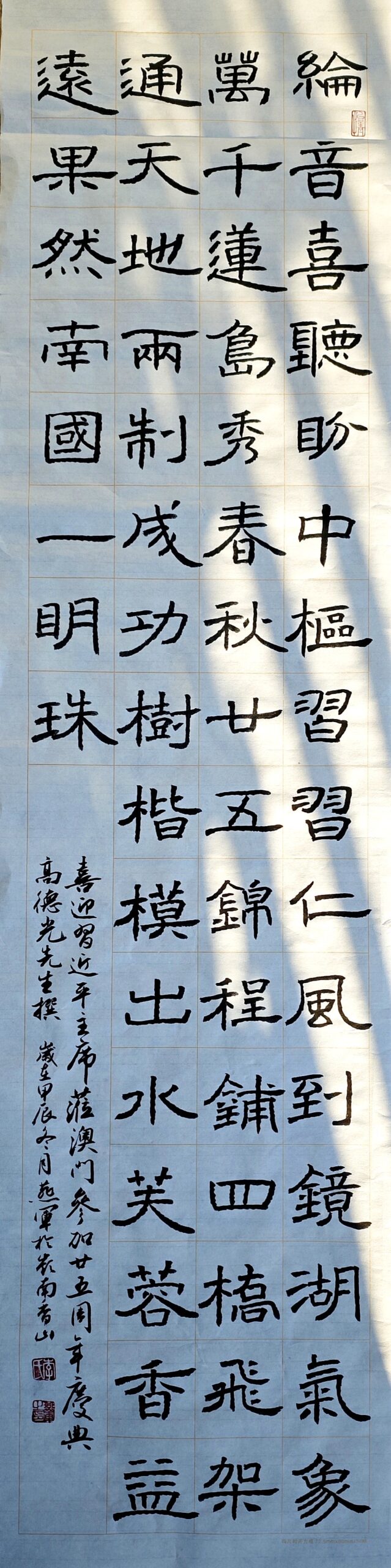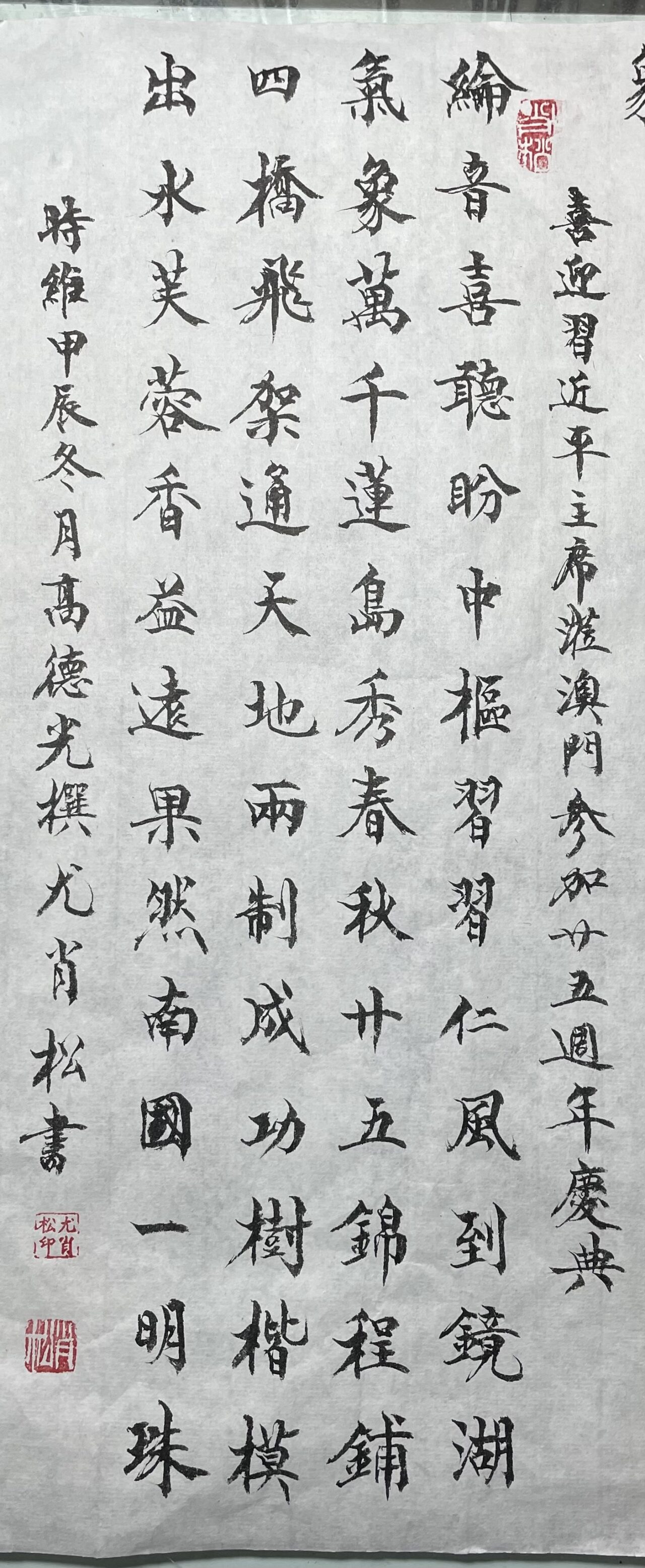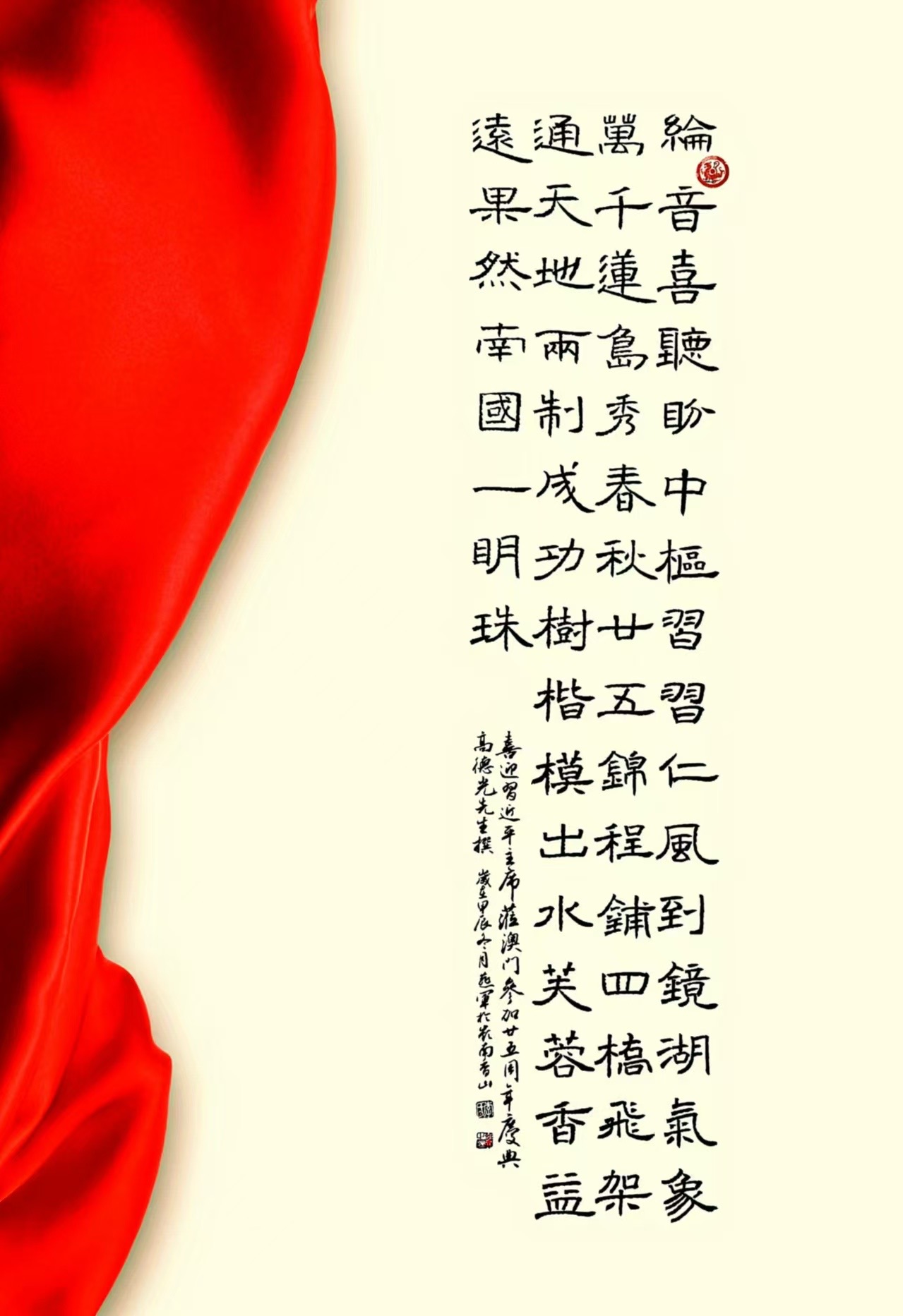 . . 華夏文明今古傳, 楚辭漢賦宋唐篇。 濠江薈萃吟風雅, 葡韻悠揚入管絃。 融滙中西相碰撞, 切磋音律共承宣。 好將世界詩歌節, 砥礪騷壇笑比肩。 书法 一〉馮利發 二〉劉北照 三〉茂松 四〉黎勝培 五〉周永騰 六〉吳錦蓮...