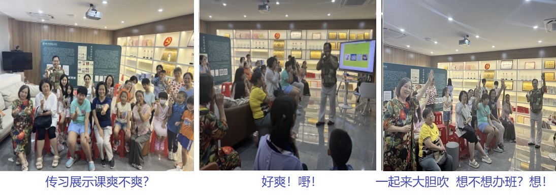 6月17日下午,一场暴雨过后,福田区桥香村党群中心106室汇集了应邀前来参加卓忠明“挖掘大自然中的宝藏”有关非遗树叶(花瓣~金叶~金叶笛~迷你笛)吹奏传承展示课的数十人。人们为非遗而聚,为快乐而学,为成功而乐。几位幸运者同时吹响了树叶和花瓣,也成了世界上少数的奇特人。从以下剪影,可以分享到他们发自内心的愉悦。