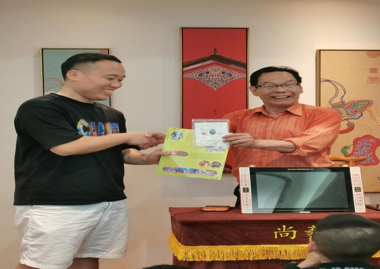 邹尚鹤老师高兴地接受卓忠明老师赠送的资料