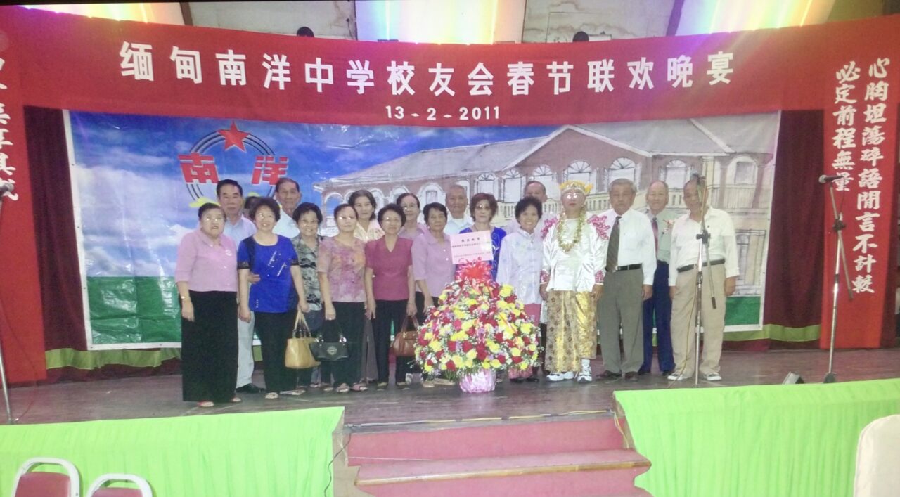 2011年,仰光华中校友会举行建校90周年晚宴,我们前往参加,相隔一个星期,仰光南中校友会举行周年晚宴,我上台表演缅甸单人舞,当时江才玉担任南中校友会主席,她上台献花送礼钱,並和其他班友一起合影留念。