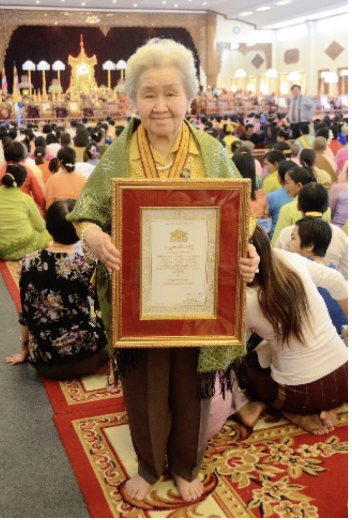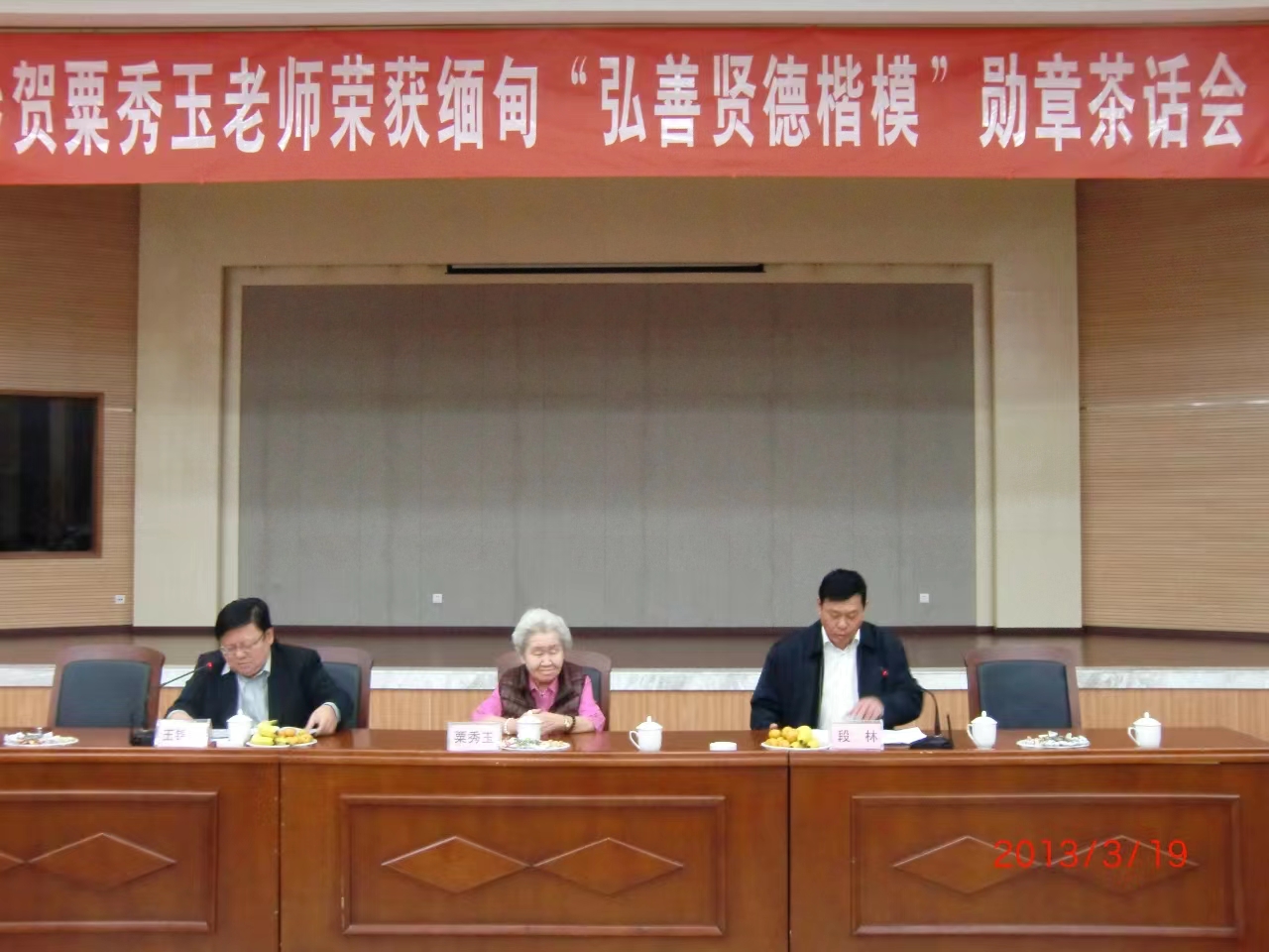 记得十年前,2013年粟秀玉先生荣获缅甸”弘善贤德楷模”勋章。云南省侨联和云南省缅甸归侨侨眷联谊会在昆明专题召开了茶话会,并赠送了“德艺双馨、光辉楷模”的字幅,送给粟秀玉先生。