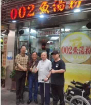 22日上午,侯总(德耕)的契子前来接我们前往他经营5家鱼汤粉连锁店之一的澳门工业街002店。当我们到达时,只见侯总从轮椅站起柱着拐杖,满脸春风的在门口迎接我们。入店后,品尝正宗的缅甸鱼汤粉“馍亨加”,实在爽口无比!话家常40多分钟,依依不舍,拍照留念,侯总还赠送我们自制的每人一瓶“马拉盏”、一瓶“辣椒酱”。并安排其公子驾车环游澳门,领略澳门的风光和风土人情,澳门道路整洁,交通次序井然,古老建筑与赌场高楼相得益彰。而后送我们回励庭海景酒店。