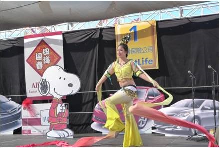 是日天亮前, 当地警察早已将山谷大道约五百米路段封闭, 各庆祝团队及商家赶在天亮时集结佈置就绪。笔者上午9时许赶到现场, 自西至东首先进入眼簾的是飞龙等电动游乐场, 由于时间尚早, 还沒有多少儿童进入。接着是连绵不断, 左右并列的小摊位, 有推销各种餅盒, 食品的, 厨房用品的, 家庭生活用品的, 均比平时价格优惠, 品种齐全, 琳瑯满目, 吸引游客, 已开始有三, 五成群游客在选购。到了正中, 中心有午台, 各演出队伍, 粉飾彩装, 磨拳擦掌, 集中待演。再过去是美食餐飲店, 各种美食热气腾腾, 香味扑鼻, 令人垂涎, 已开始有人进出。往前走是优惠照相, 花草盆栽, 服装首飾, 净水设备, 中文纲络影视, 銀行开户, 家电手机, 医疗保健, 总之, 种类繁多, 数不胜数。