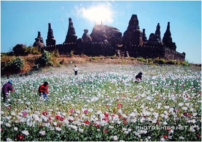 目睹金三角这罪恶的渊薮,人们不禁要探究:是谁首先把罂粟的种子撒向了金三角?使这块几乎一直与世隔绝、根本不知鸦片为何物的“世外桃源”变成了今日的毒窟?西方学者研究得出的结果是——英国人。早在1824~1826年第一次英缅战争英国刚开始侵入缅甸不久,东印度公司便把大量的罂粟种子运进了掸邦;1886年1月英国吞并缅甸全境后,强迫掸邦人民大规模种植罂粟,鸦片产量亦十分可观。英国殖民者曾把这里生产的鸦片大量运到中国销售,牟取暴利。此后,罂粟花便在掸邦地区一直盛开,并一度蔓延到缅甸的克钦、克耶、曼德勒、勃固、实皆、马圭等邦。