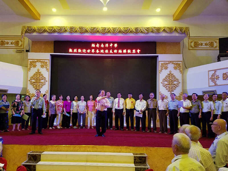 当理监事校友众贤排排站上舞台,辉煌的“梅花”大厅更增绚丽灿烂,当有力的指挥巨臂,一手托起“红星光”,一手挥起“黄河浪”,当激昂的母校校歌声响起,“梅花”大厅激荡嘹亮的,奋发的气氛,众口一声,众心一志,然而带有些微的悲喜。悲的是母校离我们远去,喜的是这首激昂的歌,如今响遍了天涯海角,世界各地,她的学子们凭着这一精神,闯天下,走四方,服务社会。接着唱的“南友之歌”,“我爱我们的南中”,“庆贺母校七秩华诞”更是学子们对母校的深情怀思。