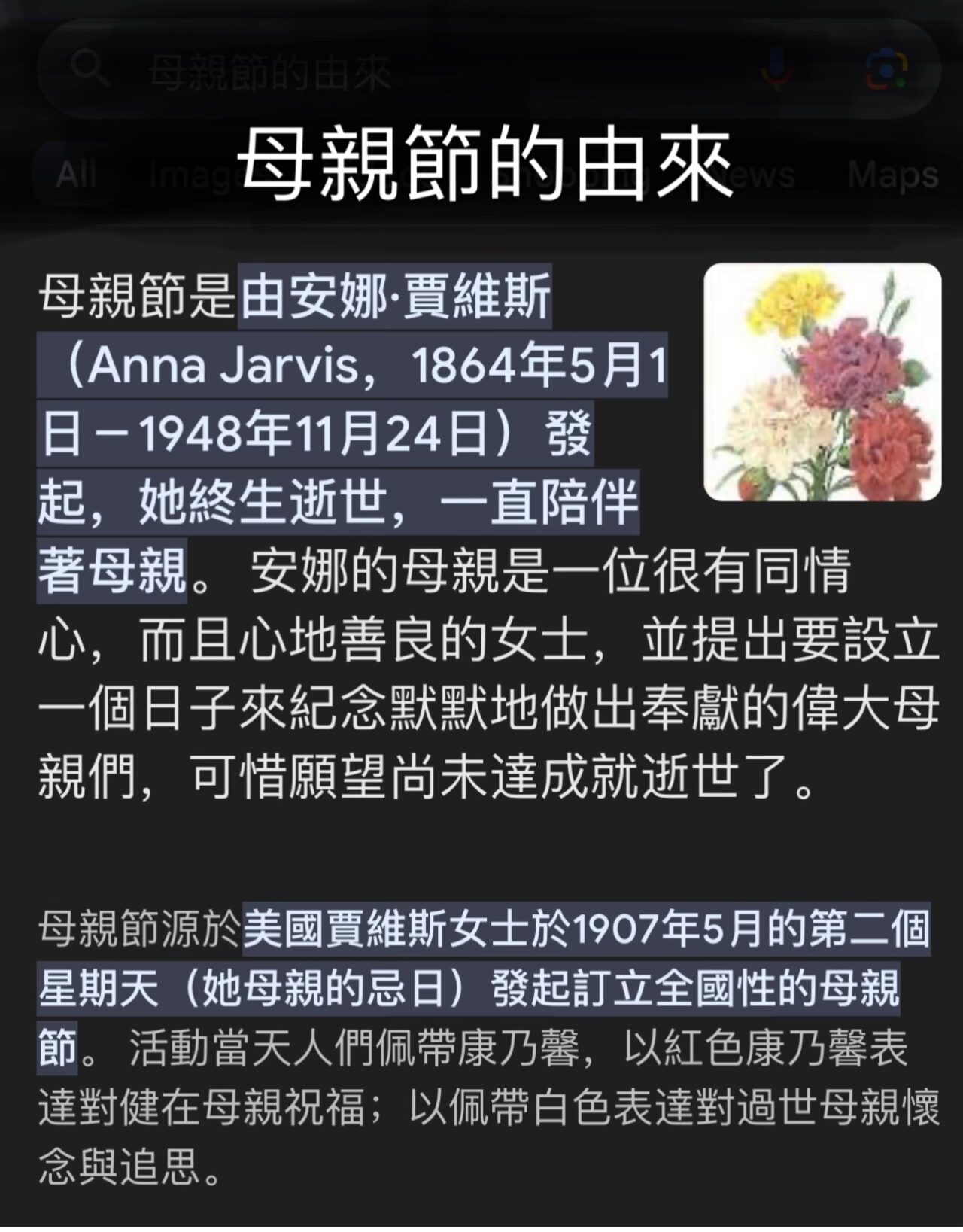 现代意义上的母亲节起源于美国,发起人是美国费城人安娜·贾维斯,这个女子终生未嫁,膝下无儿无女。1906年5月9日,安娜·贾维斯的母亲不幸去世,她悲痛万分。在次年母亲逝世的周年忌日,贾维斯组织了追思母亲的活动,并鼓励他人也以类似方式来表达对各自慈母的感激之情。