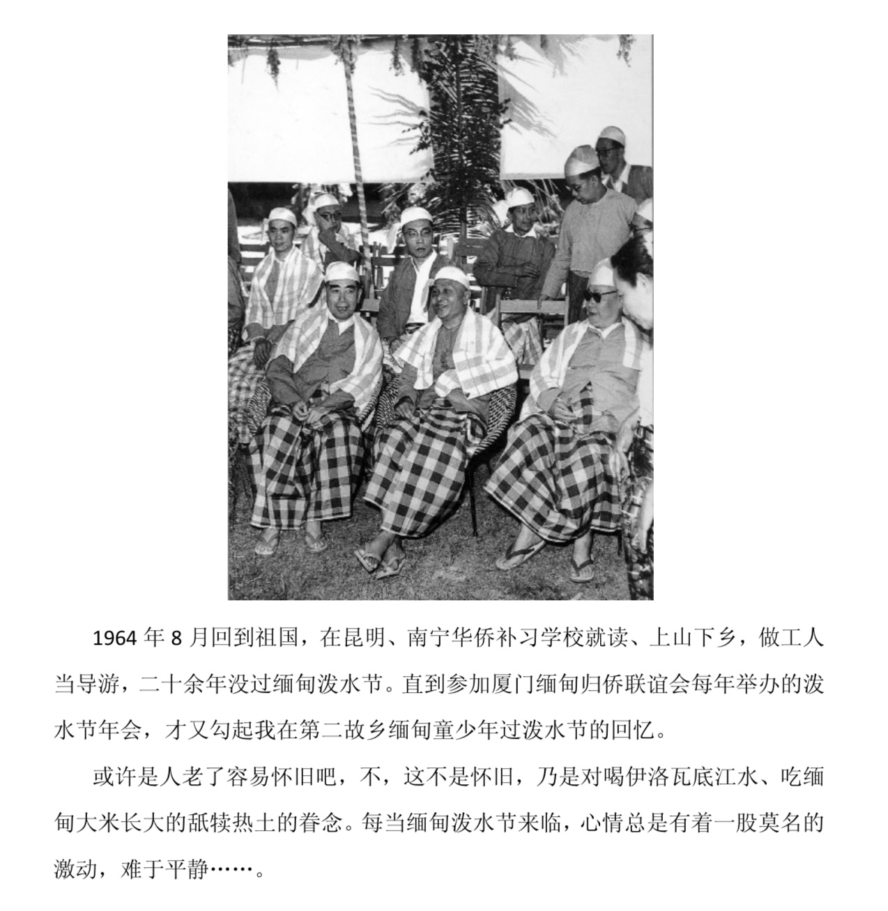 我住江之头,君住江之尾, 彼此情无限,共饮一江水。 我汲川上流,君喝川下水, 川流永不息,彼此共甘美。 彼此为近邻,友誼长积累, 不老如青山,不断似流水。 彼此地相连 ,依山复靠水, 反帝得自由,和平同一轨。 今年是中缅友好75周年纪念活动年,让我油然地回忆起上世纪六十年代我国陈毅外长的《贈缅甸友人》的著名诗句,反映了当時中缅两国的睦邻关系如同“胞波”般的亲情。 上世纪50-60年代是中缅两国友好发展的亲蜜期,让我借助此机会追忆曾福才老师的事迹:他不只是一位杰出的缅华文教工作者,更是一位缅华体育活动的积极推动者,为中缅两国的体育交流和友谊他尽心竭力,作出了很大的贡献。曾老师虽然离开了我们,但他的精神却永远留在我们的记忆里…… 2013年我在为曾福才老师的“(1947-1967年)在缅工作20年的纪念影集”的资料整理时,发见到以下珍贵的历史照片,想借此纪念活动之际,选几张岀来,让我们这一代和下一代的缅华华人和华侨能够多了解和回忆起那个年代的历史…… 1961年是中缅兩国的友好合作最亲蜜的一年,是中国体育代表团访缅最活跃的一年, 从元月份开始, 先后有中国解放军体育代表团, 足球代表队一行21人访缅友谊赛; 中国武术代表队一行19人访缅表演,中国乒乓球代表队于1961年11月6-15日访缅表演赛等, 另外, 也有中国举重代表队访缅。缅甸华体会安排各项的友谊赛和表演, 为促进中缅两国间的友谊和文化交流担当重要角色, 这些活动, 对普及和提高缅甸华侨体育活动起了很大作用。 从以下从曾福才老师收藏的珍贵历史资料照片中反映出当时中缅兩国的友谊非常亲蜜: 一九六0年四月中国总理周恩来和陈毅外长赴印度谈判边界问题时顺应缅甸总理宇汝之邀请访问缅甸时与缅甸华侨代表见面后于中国驻缅使馆内留影。 . ....