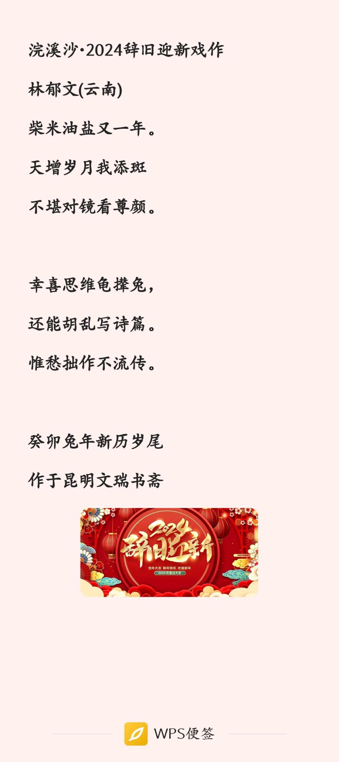 转载请注明:《浣溪沙·2024辞旧迎新戏作(林郁文/云南)》 复制链接