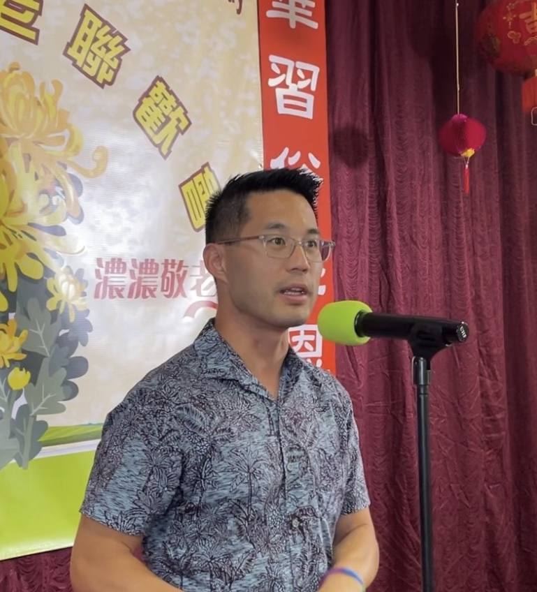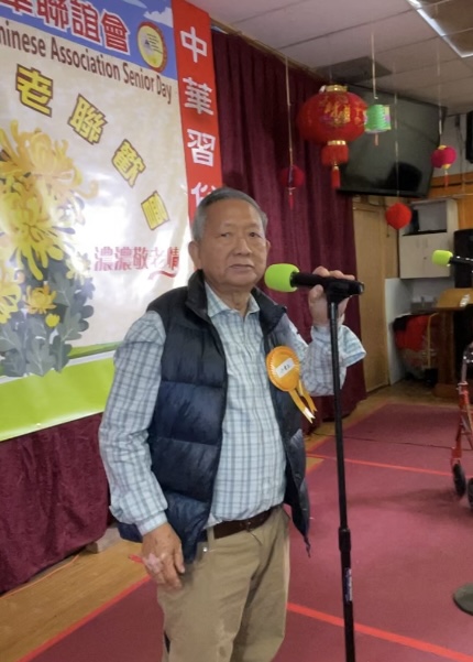 今天敬老會的主持人是由年輕的粟麗虹女士和曹莉莉女士主持。十一點左右,她們宣布大會開始。首先請陳永聯會長致辭,陳會長向來參加敬老會的老人們表達了誠摯的節日問候和良好的祝福。還感謝所有到場參加義務工作的朋友們。