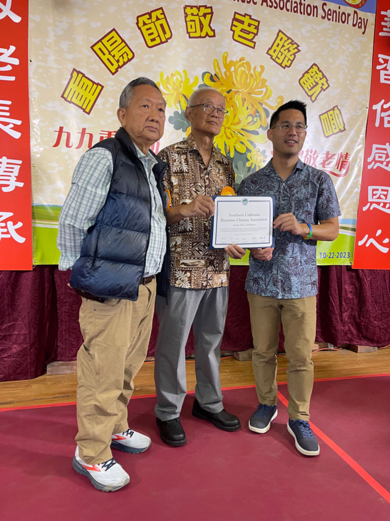 今天蒙市的副市長黃泰平先生也來參加敬老會的活動,他還頒發獎狀給緬華聯誼會,並上台致辭致以誠摯的問候。