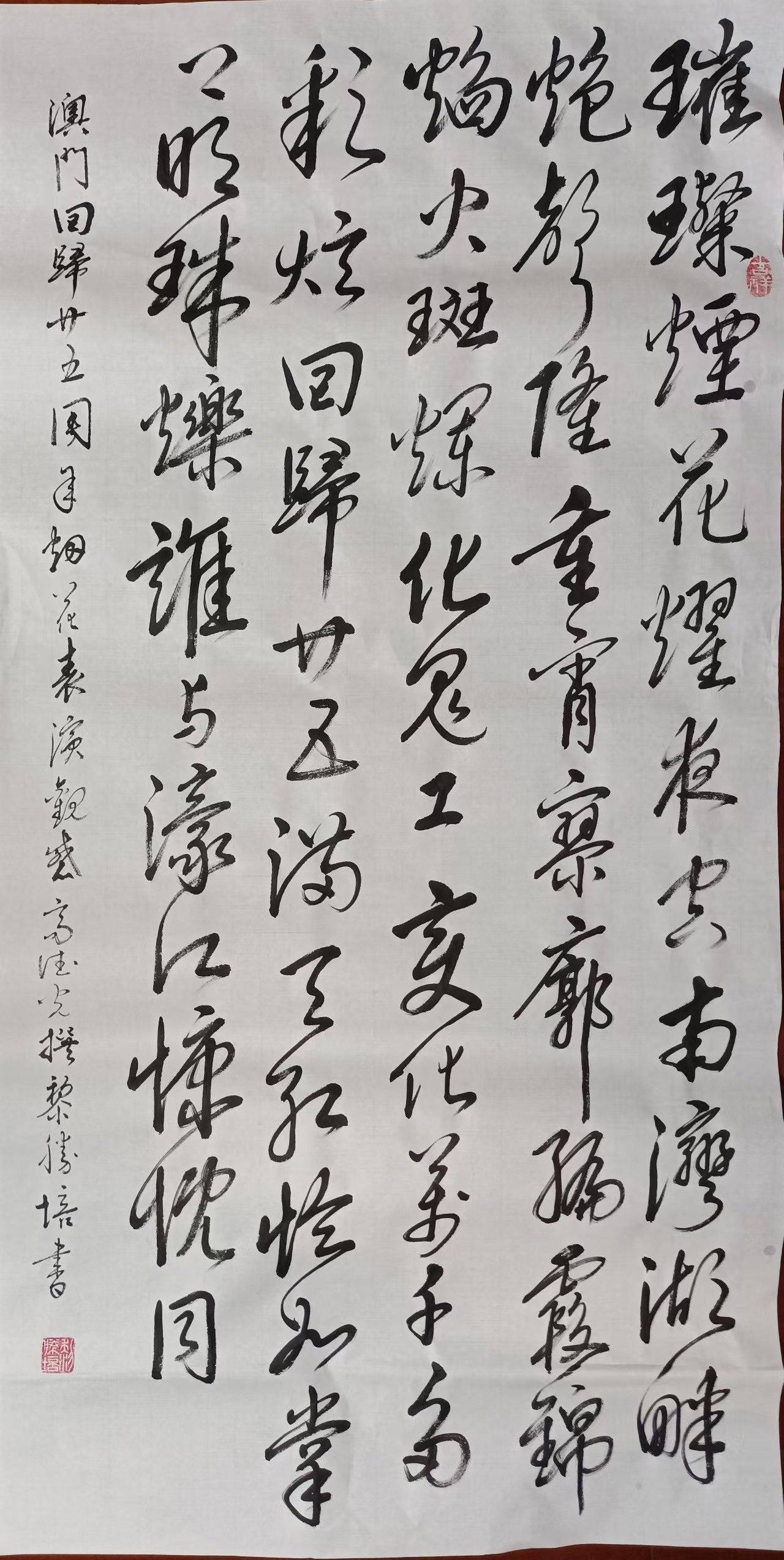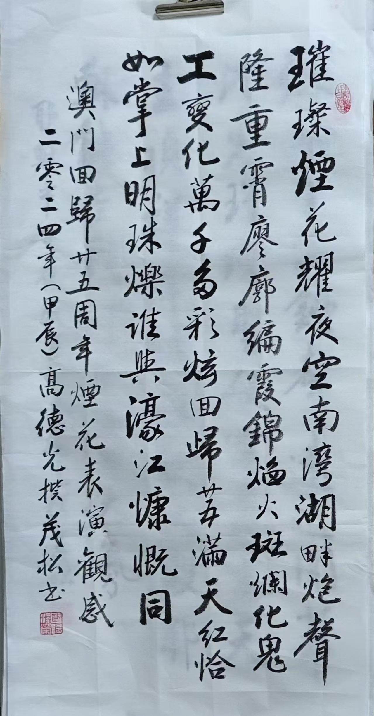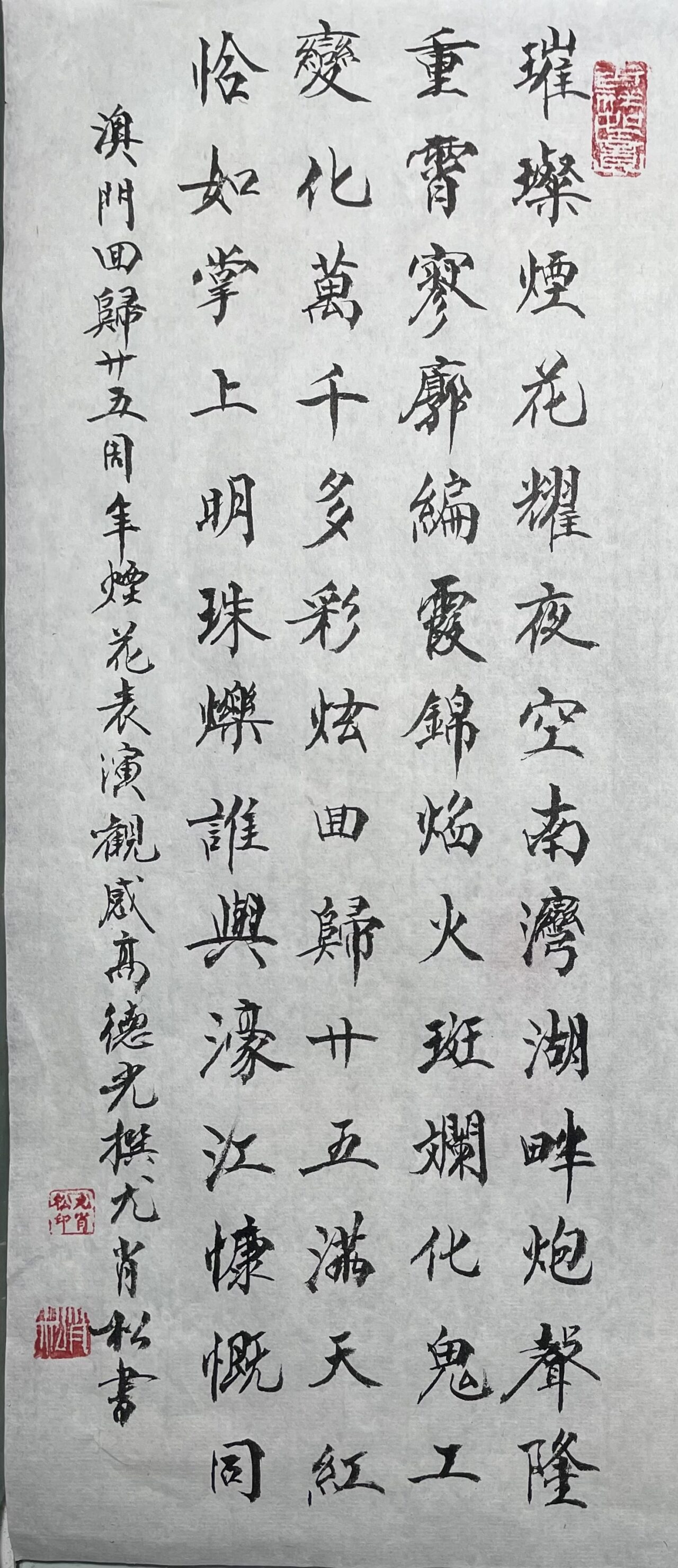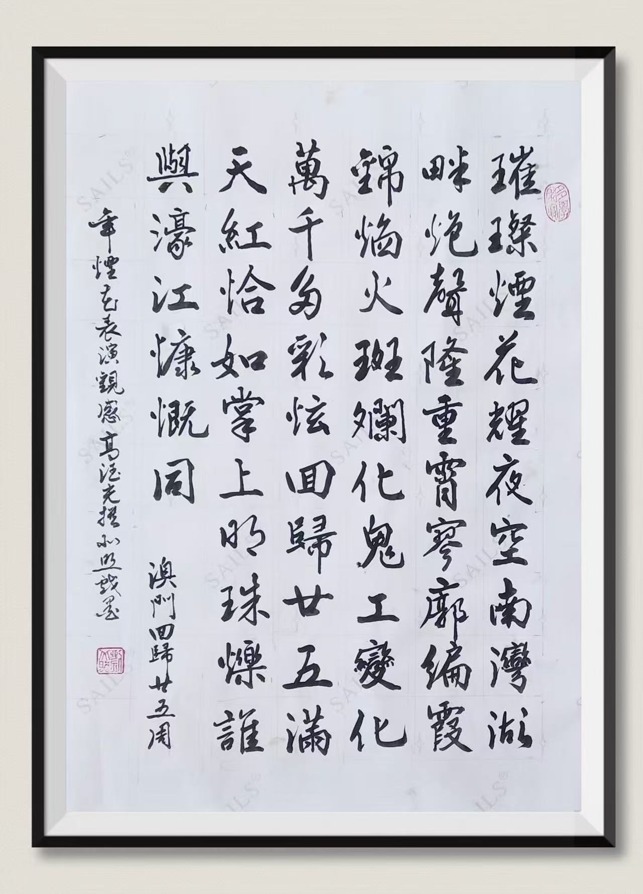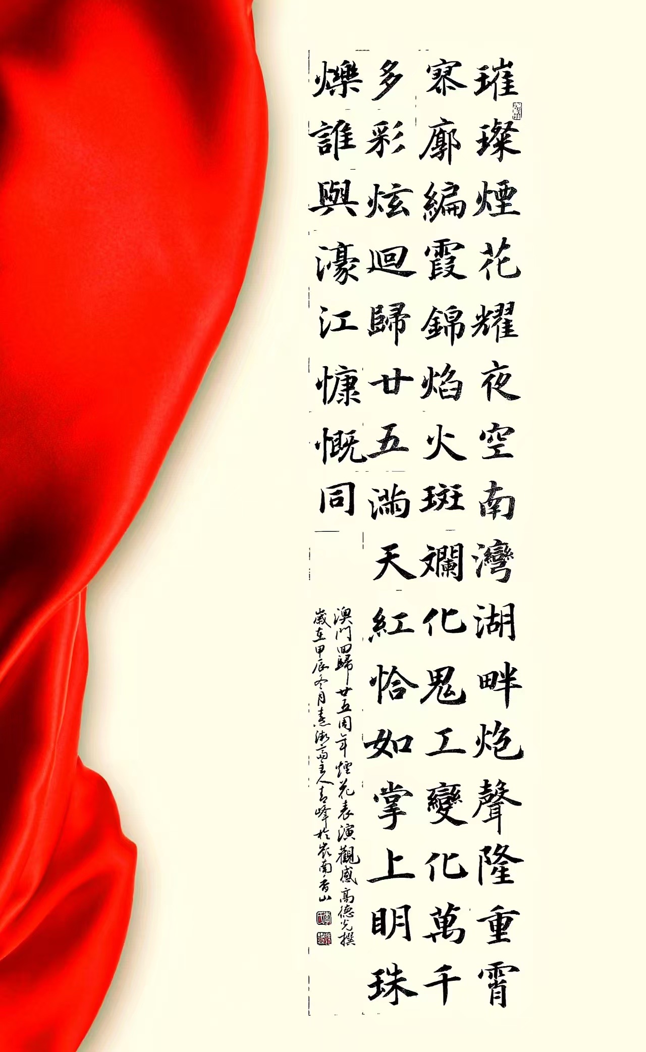 . . 華夏文明今古傳, 楚辭漢賦宋唐篇。 濠江薈萃吟風雅, 葡韻悠揚入管絃。 融滙中西相碰撞, 切磋音律共承宣。 好將世界詩歌節, 砥礪騷壇笑比肩。 书法 一〉馮利發 二〉劉北照 三〉茂松 四〉黎勝培 五〉周永騰 六〉吳錦蓮...