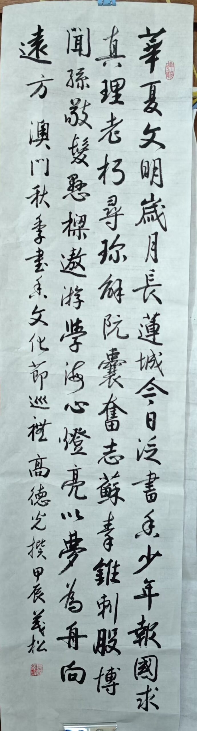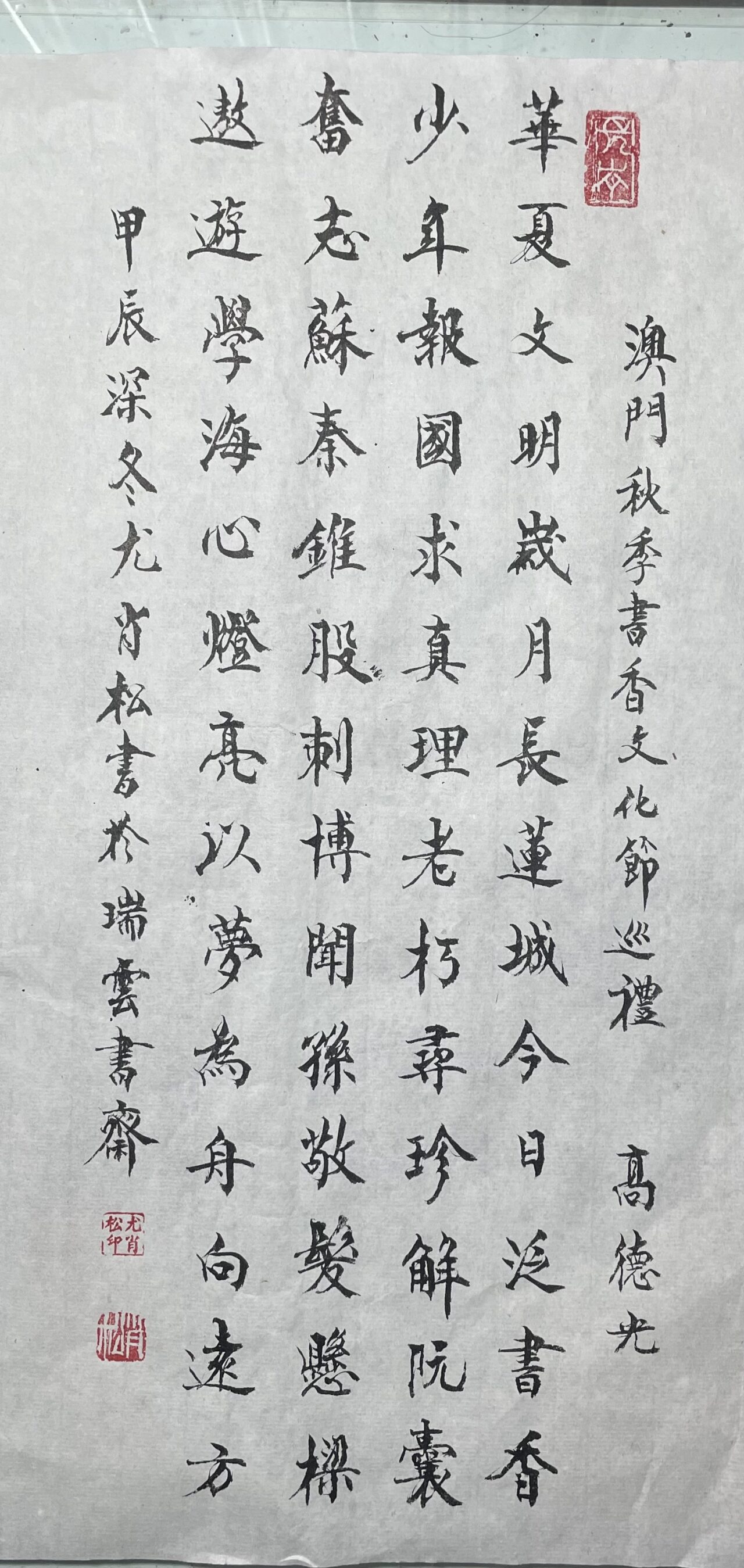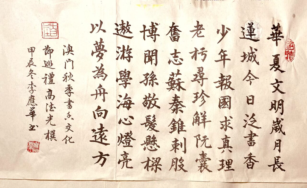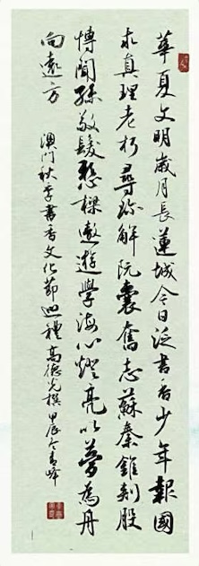 . . 華夏文明今古傳, 楚辭漢賦宋唐篇。 濠江薈萃吟風雅, 葡韻悠揚入管絃。 融滙中西相碰撞, 切磋音律共承宣。 好將世界詩歌節, 砥礪騷壇笑比肩。 书法 一〉馮利發 二〉劉北照 三〉茂松 四〉黎勝培 五〉周永騰 六〉吳錦蓮...