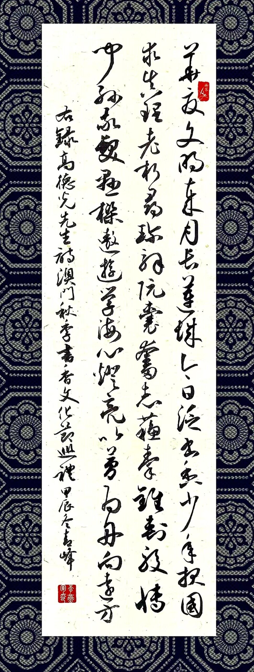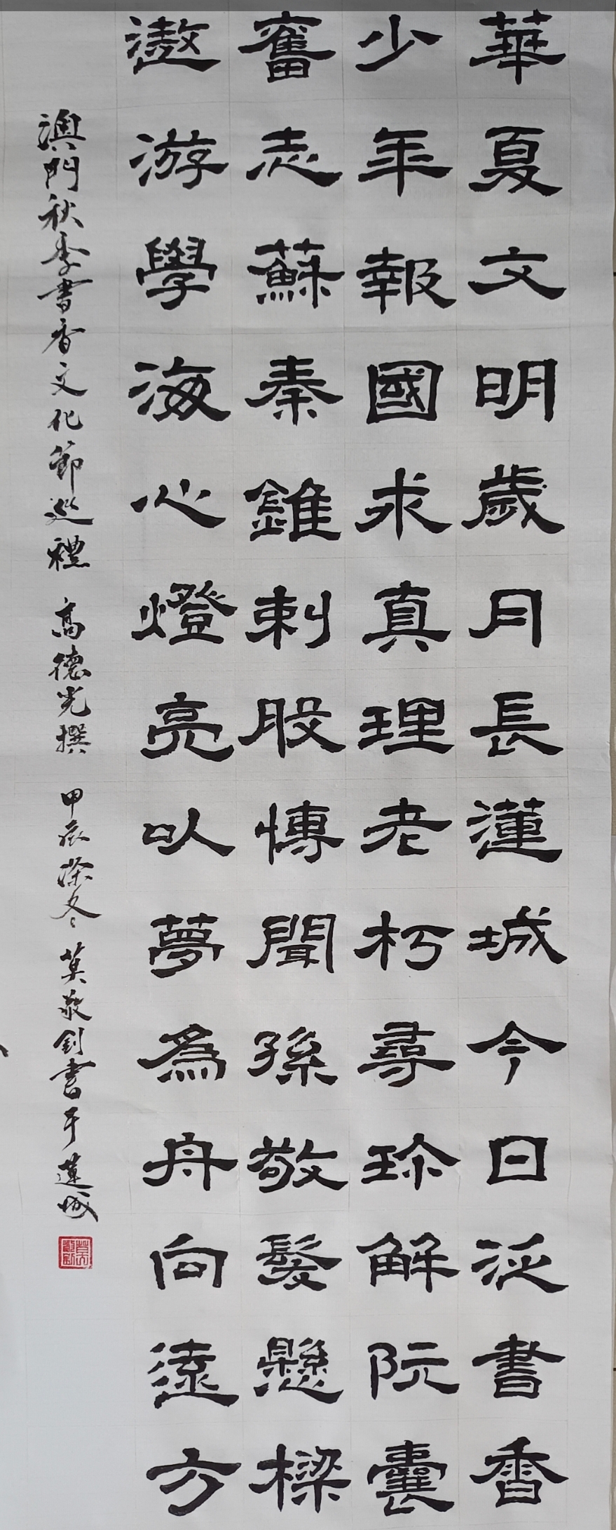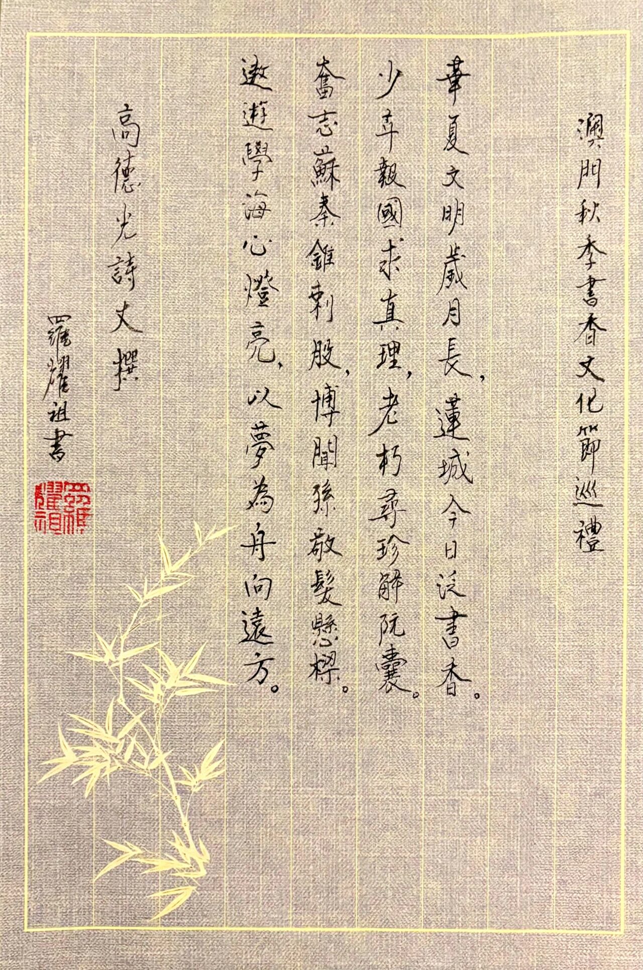 . . 華夏文明今古傳, 楚辭漢賦宋唐篇。 濠江薈萃吟風雅, 葡韻悠揚入管絃。 融滙中西相碰撞, 切磋音律共承宣。 好將世界詩歌節, 砥礪騷壇笑比肩。 书法 一〉馮利發 二〉劉北照 三〉茂松 四〉黎勝培 五〉周永騰 六〉吳錦蓮...