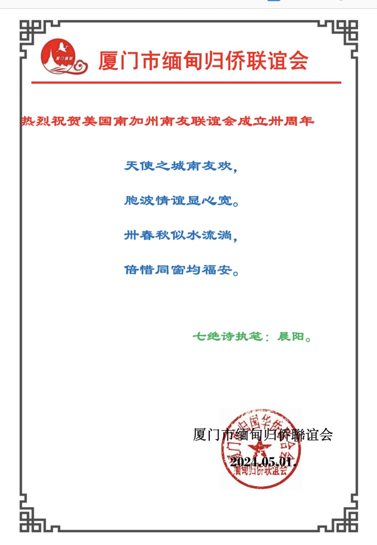 转载请注明:《祝贺美国南加州南友联谊会成立卅周年—厦门市缅甸归侨联谊会 敬贺》 复制链接