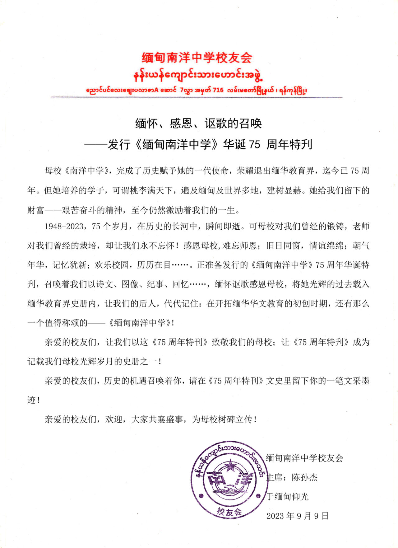 转载请注明:《缅怀 感恩 讴歌的召唤—发行《缅甸南洋中学》华诞75周年特刊(缅甸南洋中学校友会主席:陈孙杰)》 复制链接