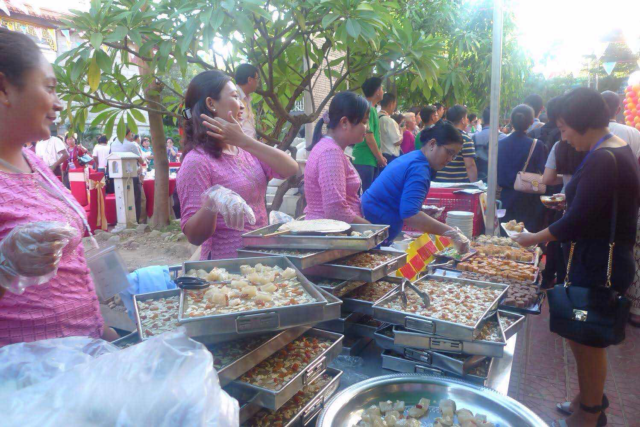 典礼结束,我们按时赶到金多堰,大堂内已摆满一排排的自助歺点,香味扑鼻的中缅风味菜肴,应有尽有,代表们各取所爱,大饱口福。