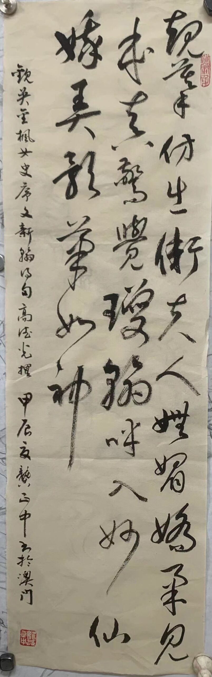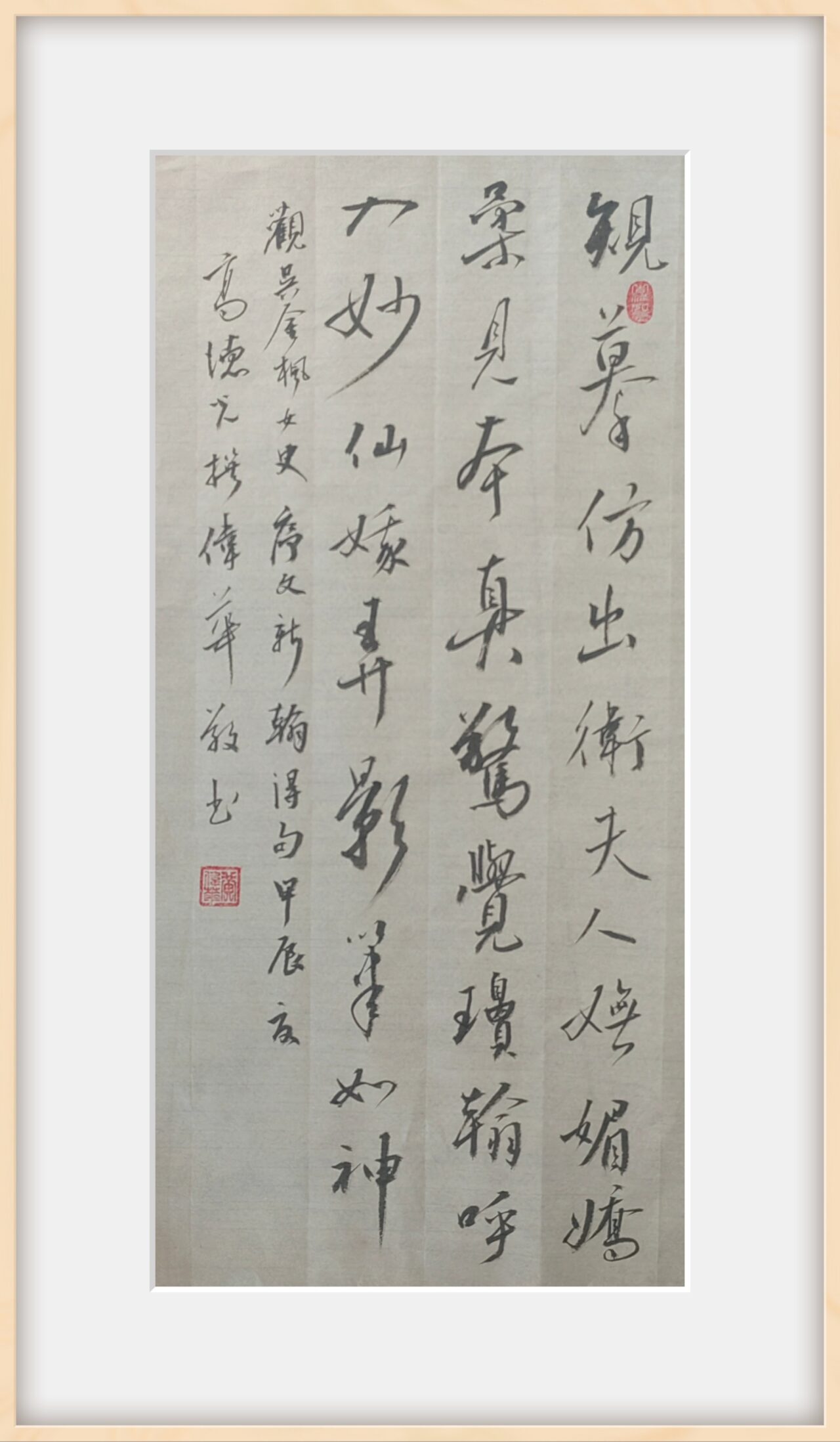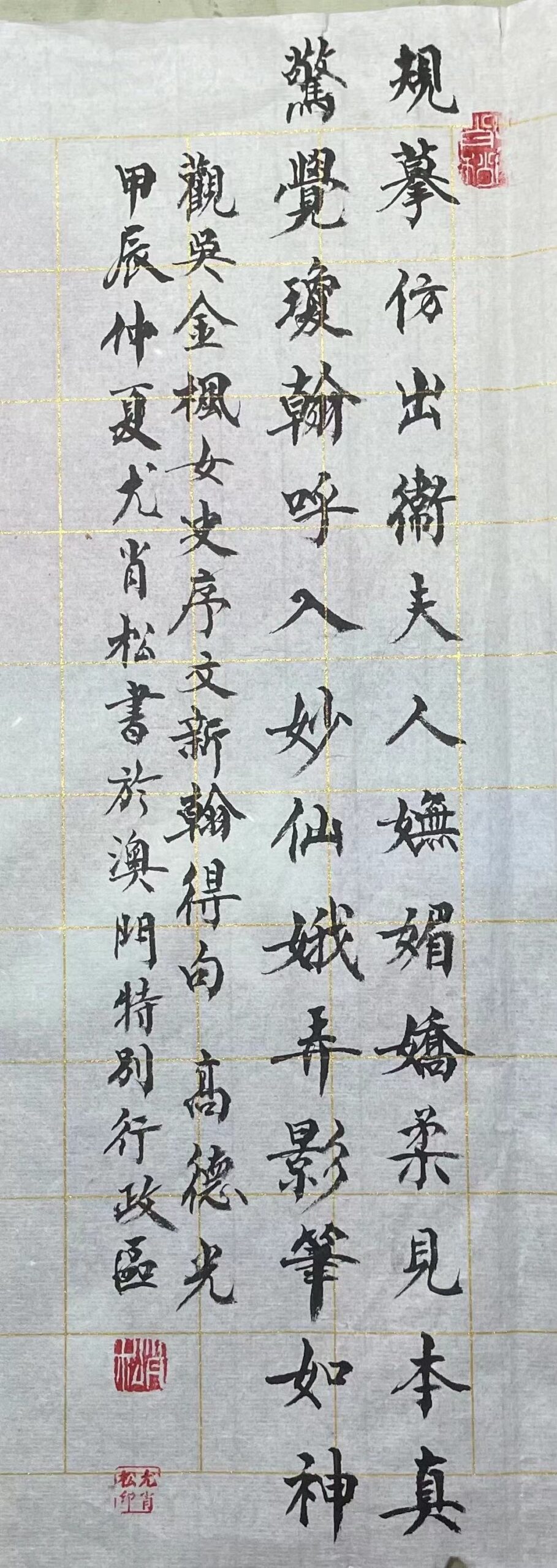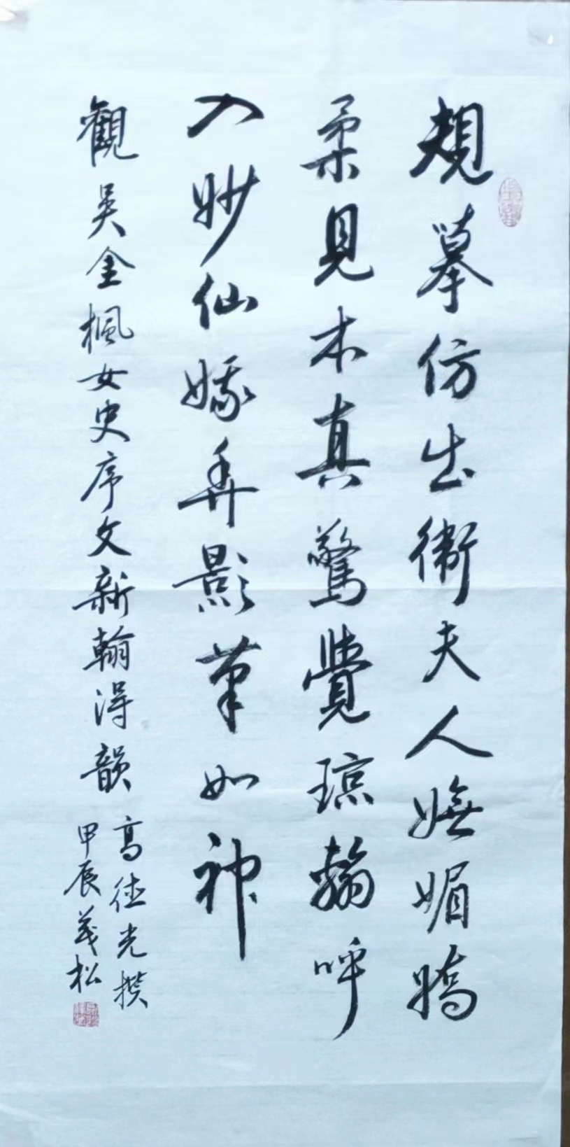 吳金楓女史的書法妍媚秀麗,仿若師從衛夫人般。嫵媚嬌柔之姿,可見其女性之細膩,心思縝密,用筆嚴謹,體現其本來面貌而不矯柔造作。今日又見其新翰,驚呼妙品也,恰如仙娥弄影,舞影翩翩,飄逸而俊秀,通篇運筆,佈局有致,謀篇亦佳,真乃神來之筆也。