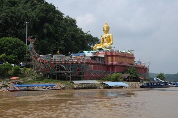 我们从这里又去膜拜了泰国皇室家族常来朝圣的(Phone Phar)大佛。在那儿也诚心敬拜了之后,因还有时间,又准备赶到老挝境内参观,所以又赶回金三角佛塔来,从佛塔附近的小船码头,渡过湄公河到老挝境内的商业街参观。我们坐在机动船上渡过湄公河时内心感到一阵紧张,又知就能参观老挝的商业街也感到激动。又得知老挝赌场是有世界水平的,而且又建有(King Royal)大酒店。赌场内聘用了4000多名缅甸、泰国和老挝籍的服务员,这些服务员中据说缅甸语员工佔了多数。