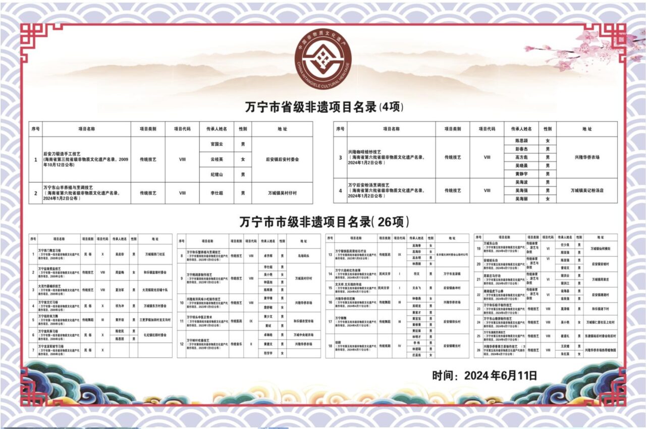 海南省非遗资深人士霍凯先生写道:万宁拥有着丰富而独特的非物质文化遗产,这些非遗瑰宝是我们先辈智慧的结晶,是历史沉淀的宝贵财富。它们承载着我们的记忆、情感和精神寄托,体现着万宁这座城市的独特魅力和深厚底蕴。