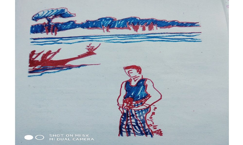 现在马阵爷一个人在村的北边,离木棉树叢不远的地方,大榕树下搭了一间小茅房住,这边大榕树下是当年搭棕榈大房,为训练桨手的住宿点,是村最神聖的地方。是当年桨手们呈现力和勇气的地方,村里赛船休整的地方。但是,就如他无限止,愚味蛮横,残忍的赌徒,使这地方如今成了荒芜的地方。