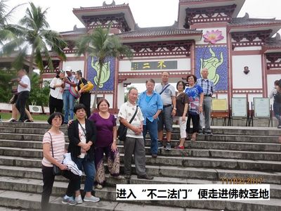 由于赶时间,我们几乎没在南山文化区的景区留连,只在 “不二”和“一实”的景区法门拍了张集体照,大门外的“不二”和大门内的“一实”相对应,进入此门便进入了吉祥清静的南山佛教圣地。这里真的非常大,有一种近在眼前远在天边的感觉。我们边走边拜,最后都走散了,各自往观音菩萨方向急步走,终于到达观音岛,在岛上围着宏伟的观音圣像走了一圈,此时已近傍晚,游客都离开了,没有机会上到莲花座,更没机会去莲花座之上抱佛脚,认真遗憾。