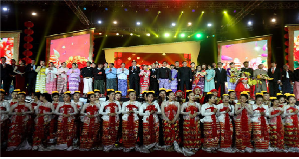 中缅两国歌手、演员和艺术家表演了12个节目,开场歌舞《相亲相爱》、联歌联舞《胞波情深》、影子舞《缅甸映像》、歌曲《共饮一江水》、舞蹈《雀之灵》、舞蹈《墨舞新韵》、歌曲《甜蜜蜜》、舞蹈《少女踢裙舞》、肩上芭蕾《东方天鹅》、歌曲《心空的翅膀》、结尾歌曲《中缅年歌联唱》使晚会高潮迭起,现场观众掌声不断,赞不绝口。
