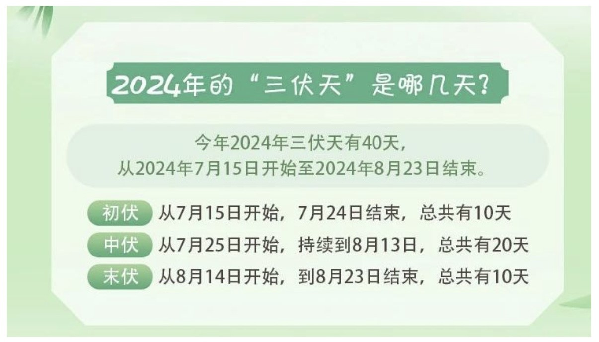 夏至三庚数头伏“是确定三伏天的依据。意思是说,按农历计算,从夏至后第三个庚日算起进入三伏头伏为10天,中伏为10天或20天,末伏为10天