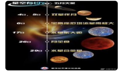 2021-05-01 12:37:39 送走4月,迎来5月。5月的“天象剧场”安排了哪些精彩大片?天文科普专家介绍,“双星伴月”“宝瓶座厄塔流星雨极大”“水星东大距”“月全食”“水星合金星”等多部“天象大片”将会轮番上映。其中,“月全食”还喜逢年度“最大满月”,这轮“超级红月亮”令人期待。(记者周润健) 责任编辑:苏亦瑜...