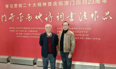 共慶回歸喜氣揚, 墨花飛舞筆花香。 廿三歲月簫韶奏, 鏡海來儀金鳳凰。 註解 一)簫韶:舜樂之名,也泛指美妙的仙樂,樂章。 二)來儀:指鳳凰感德來舞而有容儀,是一種祥瑞的徵兆。 釋文: 為慶祝回歸,澳門呈現出一派喜氣洋洋的歡欣景象。詩書畫藝術家共聚一堂聯歡雅敘,揮毫搦管,彩繪丹青,抒發著家國之情懷,瀰漫著濃濃的筆墨之香。回歸廿三年來,澳門人走過了崢嶸歲月,創造了輝煌,顯現出祥瑞的徵兆。“簫韶九成,鳳凰來儀,蓮花寶地迎來了金鳳凰啊。...