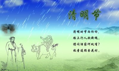 清明时节雨纷纷, 路上行人欲断魂。 借问酒家何处有, 牧童遥指杏花村。 Qingming Festival by Du Mu(万昌盛、王中英译) The ceaseless drizzle drips all the dismal day,...