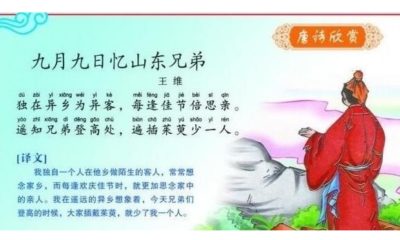 《九月九日忆山东兄弟》是唐代诗人王维的名篇之一。此诗写出了游子的思乡怀亲之情。诗一开头便紧切题目,写异乡异土生活的孤独凄然,因而时时怀乡思人,遇到佳节良辰,思念倍加。接着诗一跃而写远在家乡的兄弟,按照重阳节的风俗而登高时,也在怀念自己。诗意反复跳跃,含蓄深沉,既朴素自然,又曲折有致。其中“每逢佳节倍思亲”更是千古名句。 【原文】 九月九日忆山东兄弟⑴ 独在异乡为异客⑵,每逢佳节倍思亲⑶。 遥知兄弟登高处⑷,遍插茱萸少一人⑸。 【词句注释】 ⑴九月九日:即重阳节。古以九为阳数,故曰重阳。忆:想念。山东:王维迁居于蒲县(今山西永济县),在函谷关与华山以东,所以称山东。 ⑵异乡:他乡、外乡。 为异客:作他乡的客人。 ⑶佳节:美好的节日。 ⑷登高:古有重阳节登高的风俗。 ⑸茱萸(zhūyú):一种香草,即草决明。古时人们认为重阳节插戴茱萸可以避灾克邪。 【白话译文】 独自离家在外地为他乡客人,每逢佳节来临格外思念亲人。 遥想兄弟们今日登高望远时,头上插茱萸可惜只少我一人。 ...