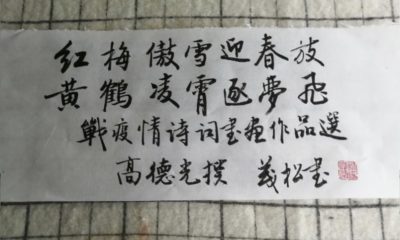 聞武漢封城抗冠毒對聯 三鎮奈封城,但見烏雲翻滾; 全民齊抗疫,待招黃鶴歸來。 偉哉中國點贊 抗毒傳飛檄, 扶傷救死時。 群雄三鎮會, 全國一盤棋。 捐贈如山積, 關懷把愛施。 瞬間磅礡力, 舉世亦稱奇。 荅友人電詢新春忙啥 疫情冷峻比霜嚴, 困守蝸居為抗炎。...